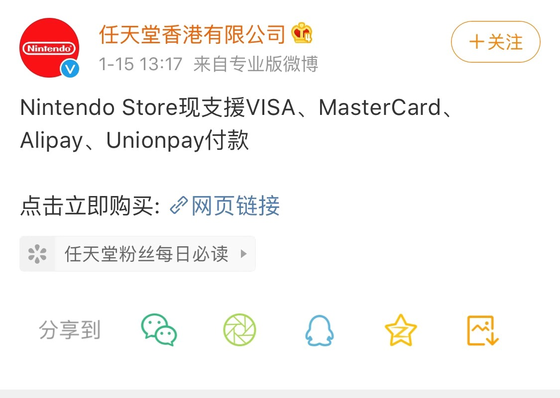 36氪获悉,任天堂官方微博宣布,Nintendo Store现支援VISA、MasterCard、Alipay、Unionpay付款。