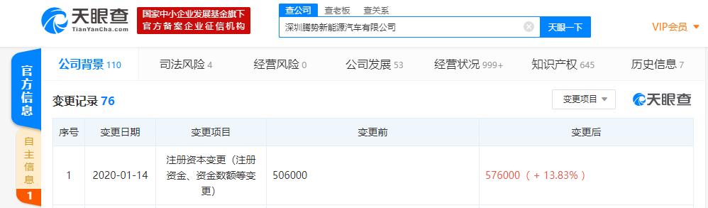 36氪获悉,天眼查数据显示,1月14日,深圳腾势新能源汽车有限公司发生注册资本新增,由原来的50.6亿增至57.6亿,增幅达13.83%。该公司是由中国新能源汽车企业比亚迪与世界豪华车制造企业德国戴姆勒共同设立的合资企业,双方各持股50%。该公司法定代表人为Hubertus Troska,比亚迪董事长兼总裁王传福为董事之一。