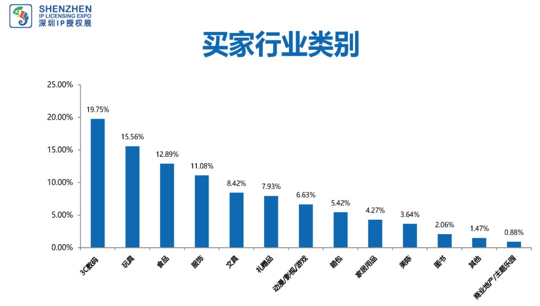 在买家分布方面,根据2019年深圳CIPE授权展展后报告,3C数码、玩具、食品、服饰,是对IP授权、联名产品开发最热衷的几个行业。