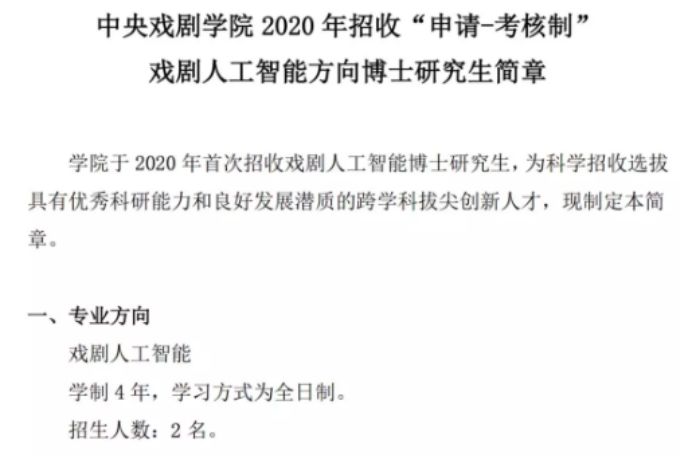 中戏首次招收戏剧人工智能博士研究生。人工智能博士研究生的要求包括:对「戏剧与影视学」学科有研究兴趣的理工类考生,优先考虑具备学科交叉背景或学科交叉能力较强的考生;具有较强的创新意识和科研能力,须提供能够体现自身学术水平、科研能力、实践能力的代表作(含论文、软件、游戏开发、出版物等)或原创性工作成果。