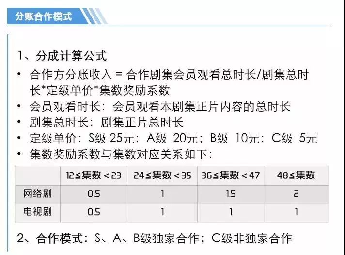 在分账模式方面,“爱优腾”(爱奇艺优酷腾讯)三网的计算方式各有不同,某种意义上,也标志了三个平台个性的差异。