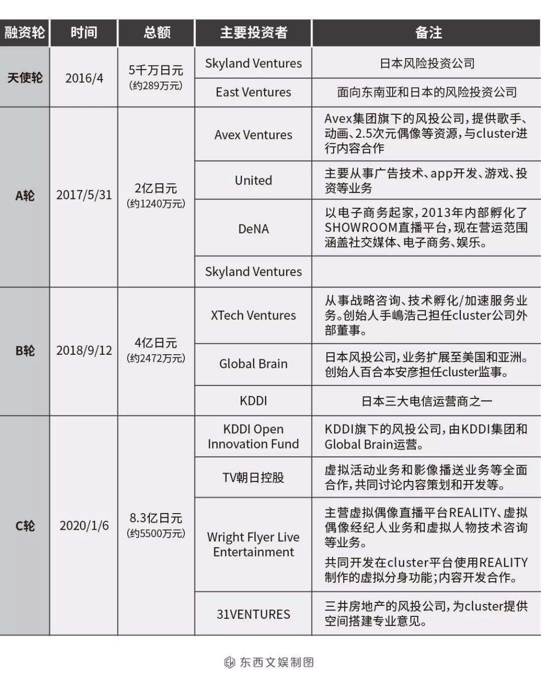 从成立至今,Cluster已完成4轮融资。B轮融资时,XTech Ventures创始人手嶋浩己同时宣布担任公司外部董事。除了风投公司,Cluster还吸引了偶像艺人经纪业务为主的Avex集团、日本三大电信运营商之一KDDI、日本五大电视网之一朝日电视台、专注虚拟偶像事业WFLE和实业公司三井不动产的投资。