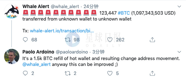 Bitfinex首席技术官Paolo Ardoino转发该推文并表示:“这其实是一个1500 BTC的热钱包达到储值上限,并由此引发的地址移动。Whale Alert应改进关于此类交易的警报。”