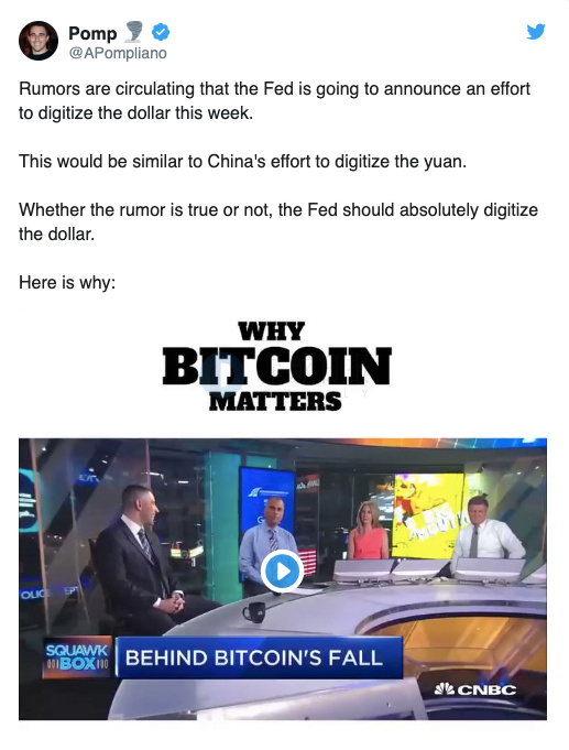 区块链风险投资基金Morgan Creek的联合创始人Anthony Pompliano今日发推称,有传言称美联储计划宣布一项将美元数字化的计划,与中国数字化人民币的努力类似。Pompliano称,不管谣言是否为真,美联储都绝对应该将美元数字化。(The Daily Hodl)