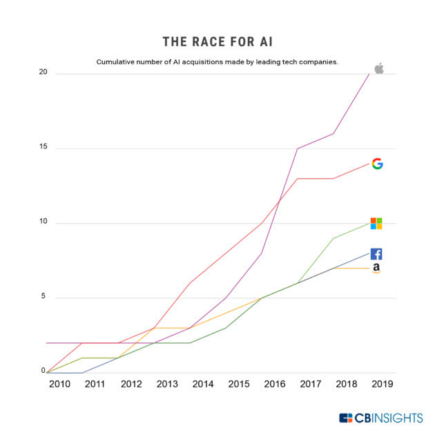 有媒体去年统计称,AI收购反映出大型科技公司需要获得稀缺的AI专业知识。根据CBInsight的数据,苹果尤其渴望收购AI初创企业,在2019年引领所有科技公司进行相关收购。