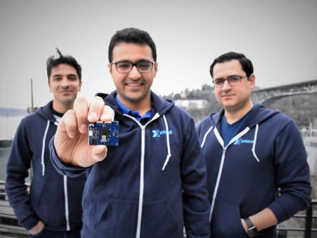 Xnor.ai机器学习工程师海萨姆·巴格利内扎德(Hessam Bagherinezhad)、硬件工程师萨曼·恩德里帕里齐(Saman NDerparizi)和首席执行官法哈迪展示了可以使用太阳能驱动的AI检测人脸的芯片