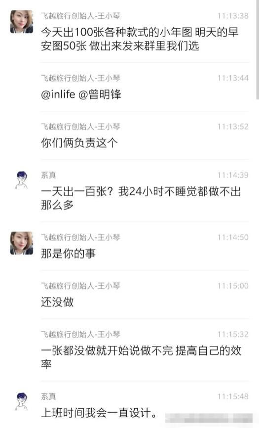 近日,微博上一则“一公司员工被要求1天做100张设计图”的消息火了。飞越旅行创始人王小琴要求公司设计师在一天时间里设计出“100张各种款式的小年图“和”50张早安图“。