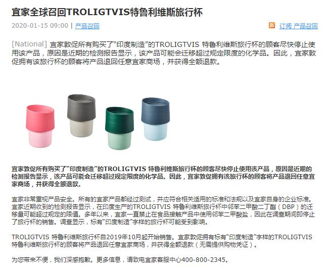 1月15日,宜家中国官网发布公告称,在全球范围内召回印度产TROLIGTVIS特鲁利维斯旅行杯。