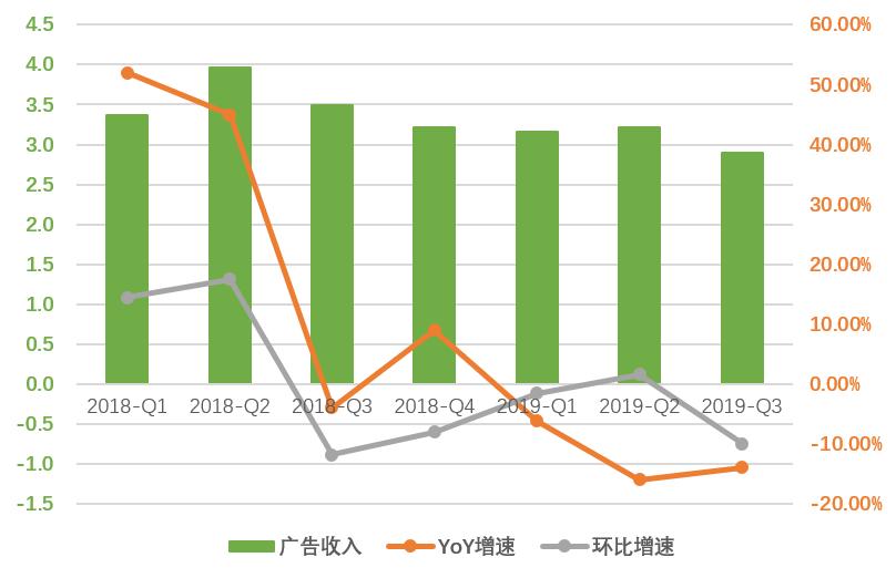 ↑ 爱奇艺广告收入增速自18年Q3开始断崖式下滑,目前环比与同比增速都在负增长
