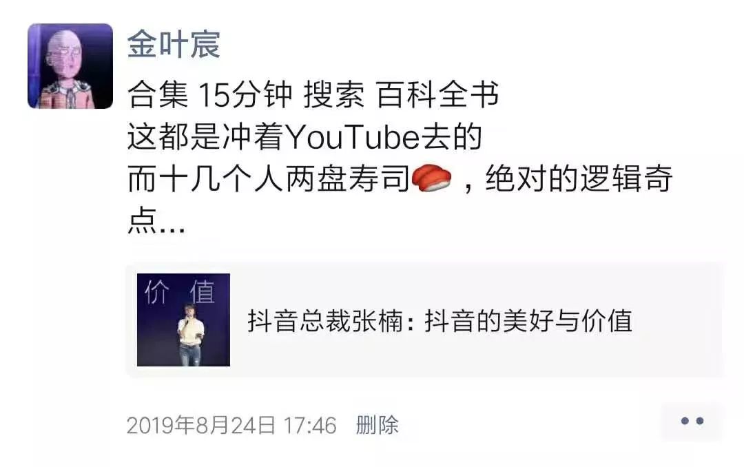 2019年8月24日,我去参加抖音创作者大会的时候,当天抖音发布了15分钟长视频、视频合集等一连串的功能,张楠还在公开场合首次把抖音定义成“视频的百科全书”。当时我就发了两条朋友圈。