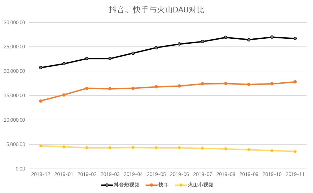 ↑ Questmobile的抖音、快手和火山的DAU趋势