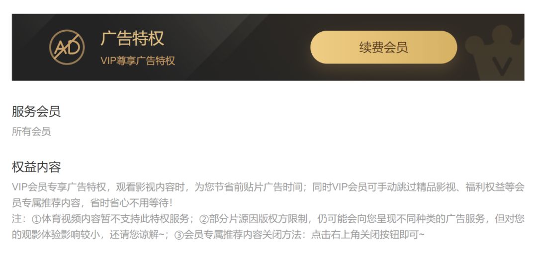 在爱奇艺的会员权益里写的明明白白,会员专享广告特权,减少前贴片广告时间。当然爱奇艺已经足够鸡贼,买会员只能去掉的是“前”“贴片”广告,而且是“减少”,并不是“消除”。也就是会员至少也得看5秒前贴片广告,而中间插入的广告小剧场、角标广告、后贴片广告、暂停广告……这些都不在会员特权中。