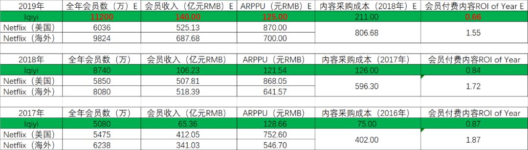 换句话说,原本ROI就只有Netflix一半不到的爱奇艺,2018年投入购买的内容在2019年的产出效率又降低了。爱奇艺2019的前3个Q大概完成了15亿美金的会员收入,目前我预测爱奇艺2019年Q4大概能完成5.8亿美金的会员收入,全年能完成的会员收入大概20.92亿元美金,付费会员数量在2019年底能达到1.12亿。如果按照我的预测来测算,爱奇艺的付费会员的ROI水平会从过去两年的0.85左右跌至0.66的水平。