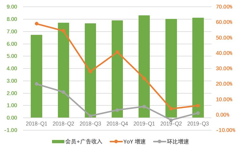 ↑ 会员+广告两块收入的同比与环比增速整个2019年在快速下降,很明显进入了瓶颈期