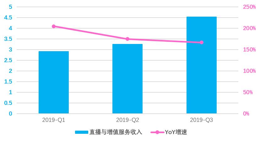 而这个时候,B站的第二个问题“商业化与MAU相关性低”就变得非常致命了。虽然B站2019年3个Q的财报中收入部分其实还不错,尤其直播与增值服务的部分,连续三个Q的YoY增速都没有低于150%。