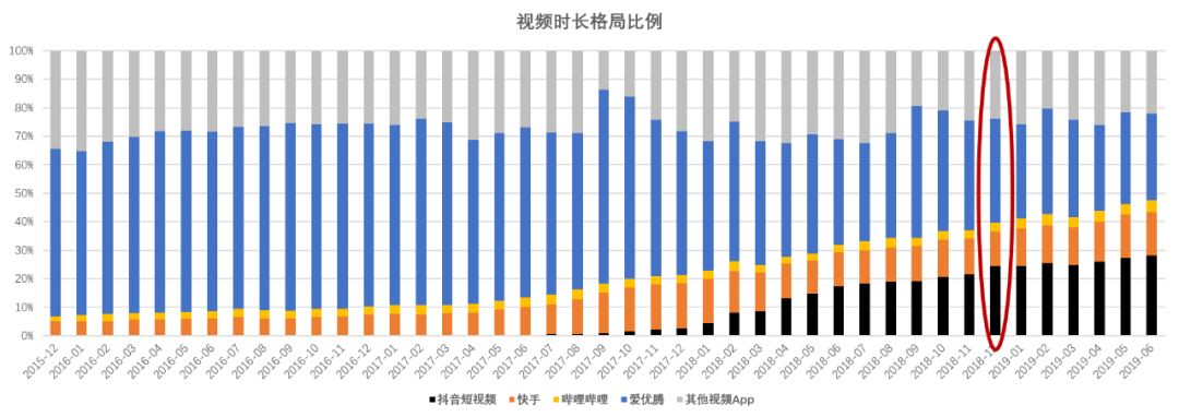 ↑ 2018年12月的时候,抖音快手的单月时长在视频领域的占比第一次超过了爱优腾三家