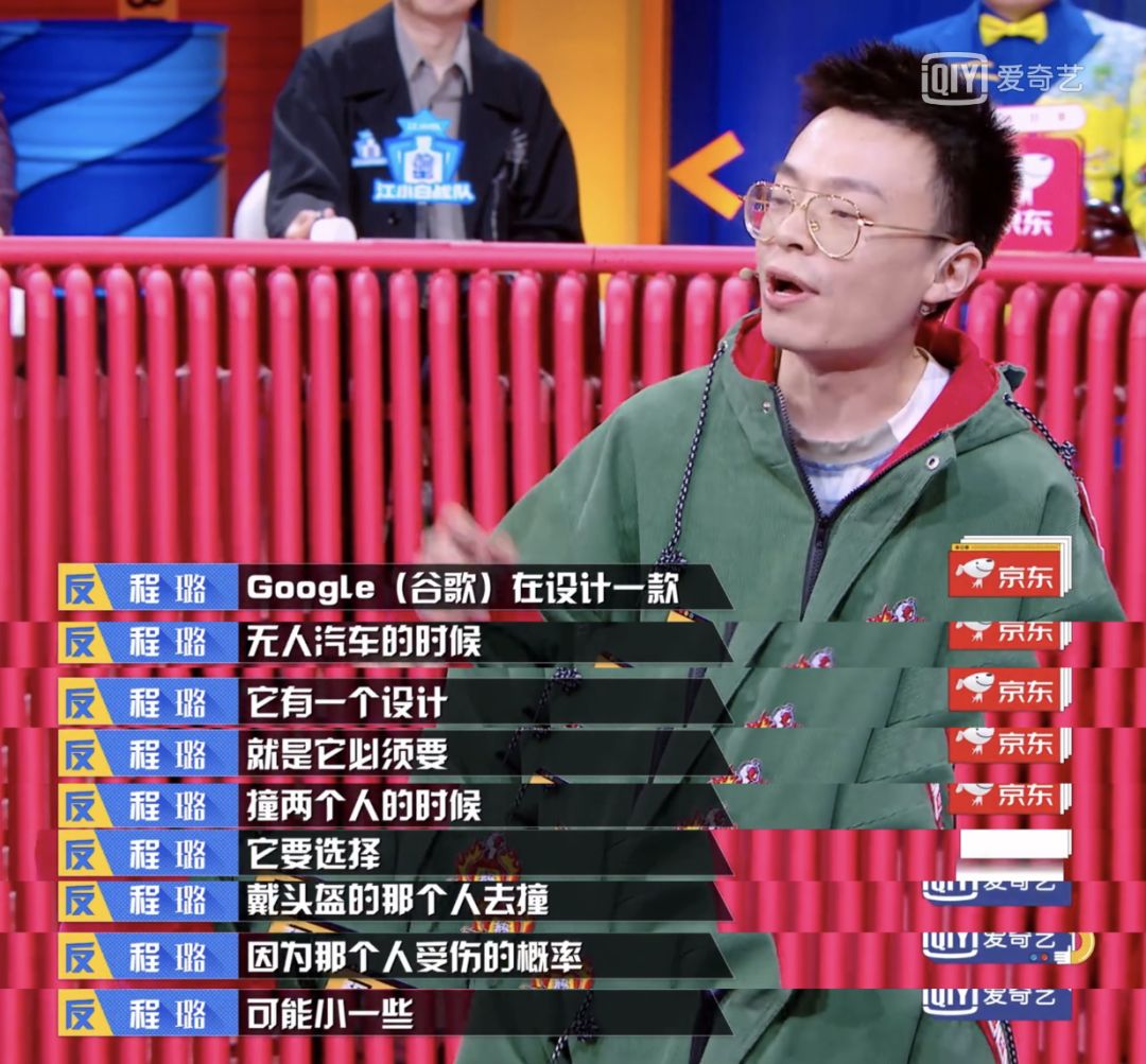 再比如程璐在讨论辩题 #对事不对人真的 OK 吗#时,他举了一个很生动的例子——谷歌在设计一款无人汽车的时候,它有一个设计,就是必须要撞两个人的时候,它要选择戴头盔的那个人去撞,因为那个人受伤的概率可能小一些。