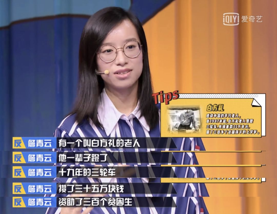 紧接着她举了“感动中国人物”白方礼老人的例子,这位享年 92 岁的老人蹬了十九年的三轮车,攒了三十五万块钱,资助了三百个贫困生。