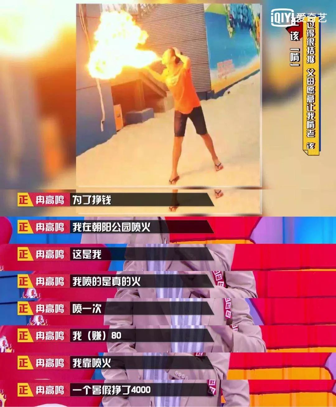 随后他讲述了自己的故事:为了挣钱,大学的时候他在朝阳公园喷火,喷一次赚 80 ,一个暑假挣了 4000。