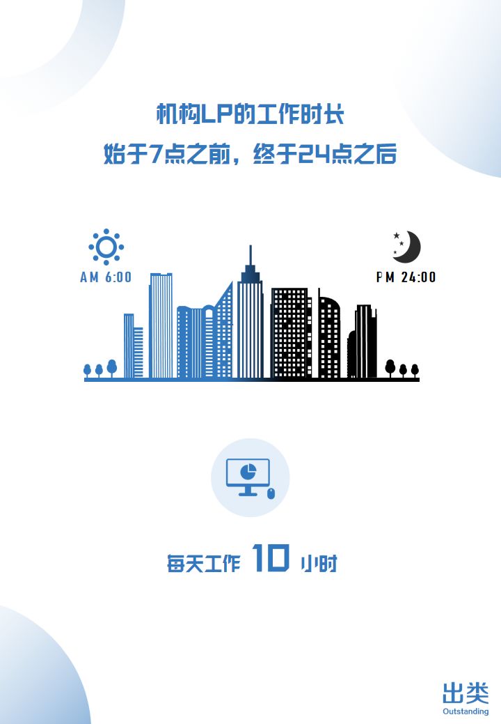 忙碌,是机构LP无法摆脱的工作常态。近6成LP每天睡眠时长在5-7小时之间,最早5点起,最晚凌晨1点之后睡。严格遵守“965”工作原则的LP仅占37.5%,且其中近八成来自于政府引导基金,多数LP都是“965+高频加班”,甚至“996”和“007”。