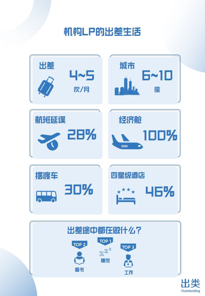 在出差的配套选择中,飞行交通上,机构LP100%会选择经济舱,住宿环境上,近7成LP会选择三星及以上的酒店,途中常以睡觉、看书、工作打发时间。