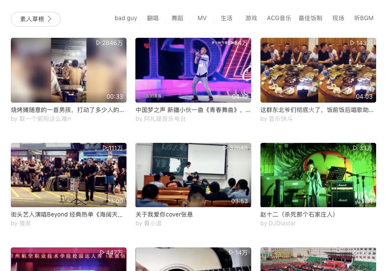 第三类,则是草根音乐爱好者的演绎形式,还是以翻唱、改编当红歌曲居多,视频拍摄比较随意,少数也会进行创新,比如在2019年火起来的《一曲相思》、《桥边姑娘》,引发了不少草根素人的另类快手抖音式演绎,不止于唱歌,也会有跳舞、乐器演奏、剪辑、夸张对口型等内容,也降低了音乐的参与门槛。