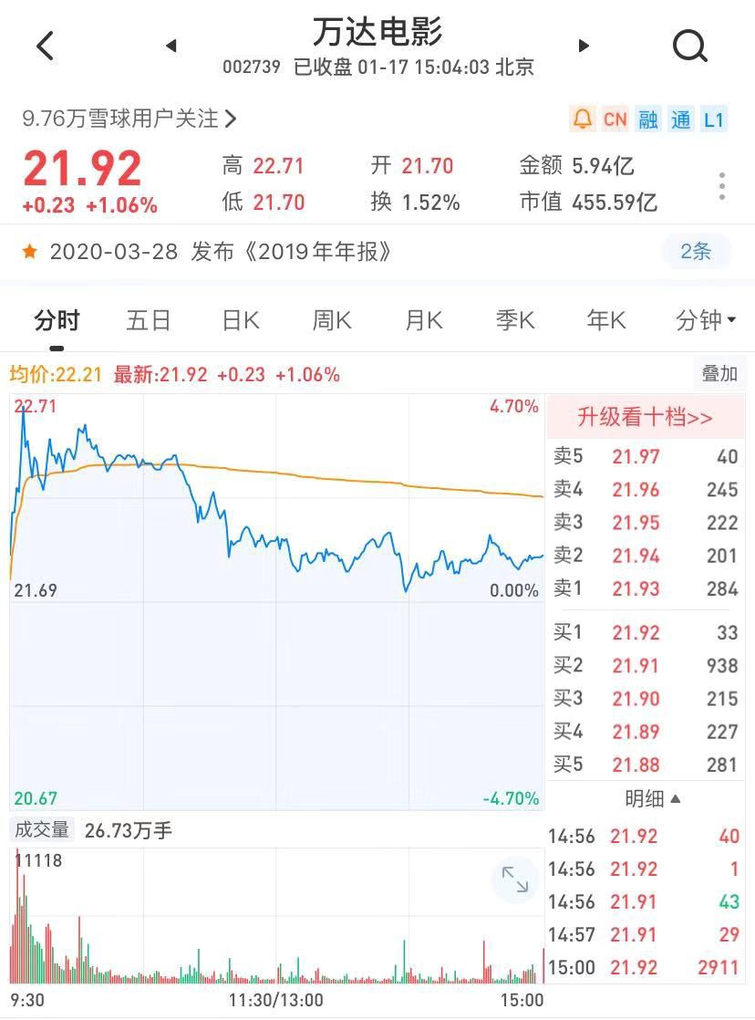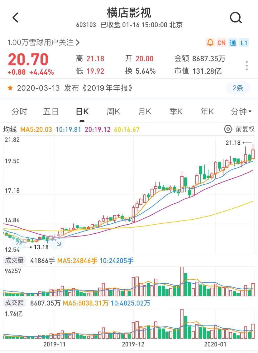 近日保持着强劲上涨势头的还有横店影视,1月16日开盘价为20元,最终收盘价20.70元,涨跌幅4.44%。随着春节档电影预售的开启,横店影视也将会继续保持此番喜势。横店影视不仅是《囧妈》、《熊出没·狂野大陆》的出品方及主控发行方,也是《中国女排》和《紧急救援》的联合出品方及联合发行方,还以24亿元保底了《囧妈》,再加上院线业务上的收入,大有称霸档期的势头。