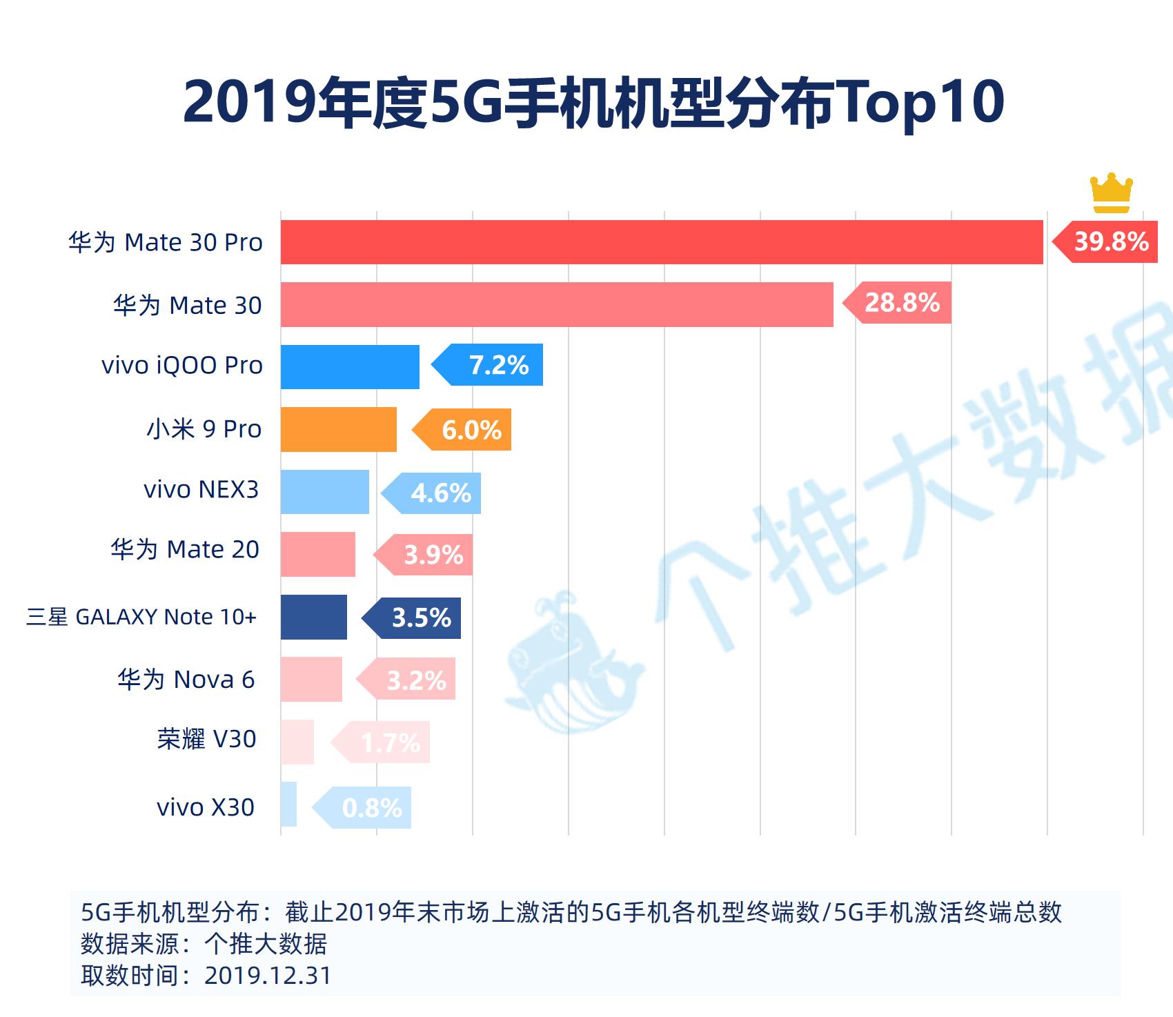 4、2019年上市的5G手机中,华为Mate30 Pro5G版最受欢迎,存量占比39.8%;