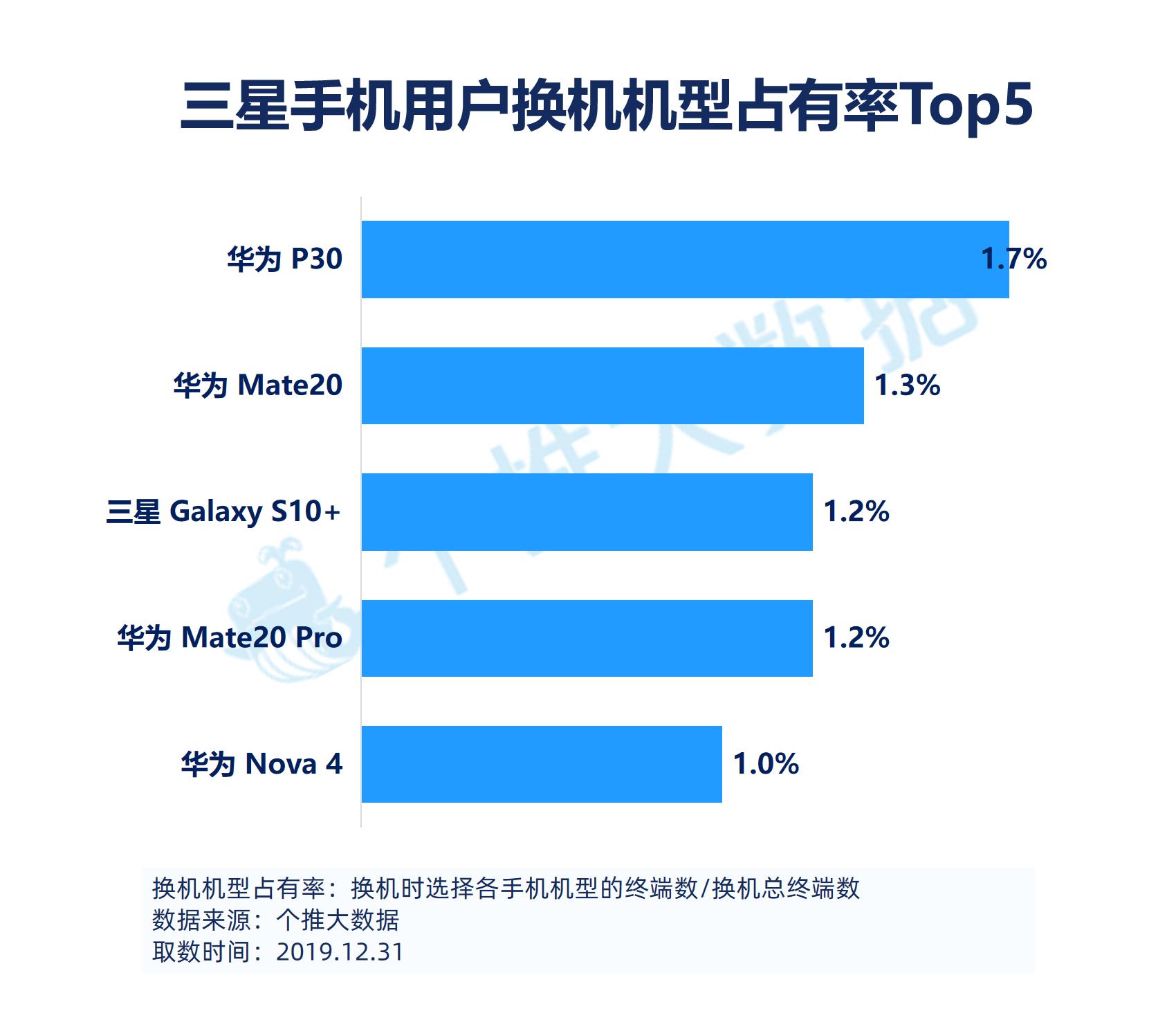 从换机机型数据来看,华为P30是2019年度用户换机时的最热机型,2.8%的华为换机用户选择了该机型,另外还有1.7%的三星换机用户也选择了该机型。此外,华为、小米手机的用户换机时选择的Top5机型全部是本品牌的手机,以此可见这两个手机品牌的用户粘性很高,死忠粉不少。以下是各品牌手机用户的换机机型占有率Top5数据: