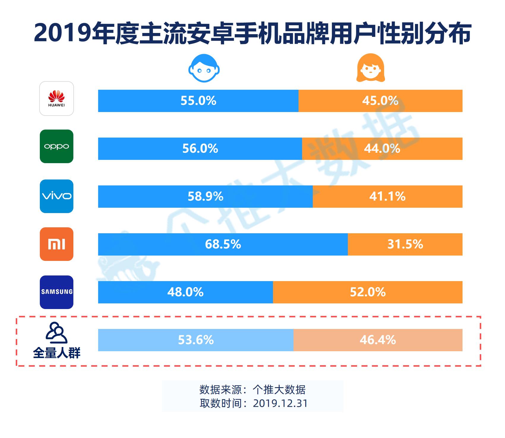 截至2019年末,华为、OPPO、vivo用户中性别分布与全量人群性别分布接近,没有明显差异。而小米手机男性用户占比68.5%,远高于全量人群中的男性比例,显然小米手机对男性用户的吸引力较强。相反的,三星手机女性用户占比52.0%,明显高于全量人群女性占比,显示出三星手机的女性用户偏好明显。