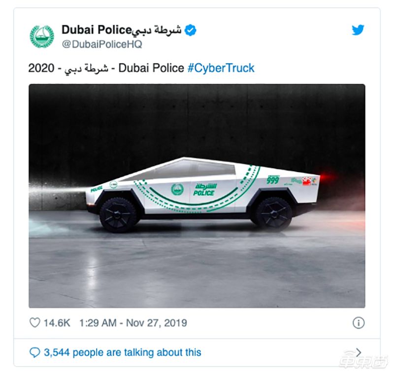 Cybertruck发布不到一周,迪拜警方就在推特上发布了张特斯拉电动皮卡的图片,图片里的Cybertruck已经“穿上”了迪拜警队的绿色制服。