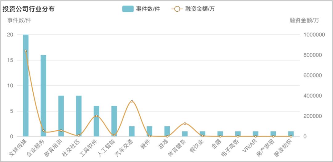 企名片的统计显示,在字节跳动迄今为止披露的77个投资事件中,文娱传媒为其最主要的投资赛道,总计20个;企业服务、社交社区、教育培训则紧随其后。