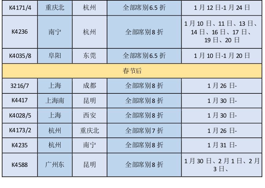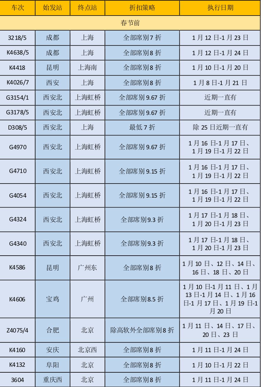 同时出行一客留意到,相较去年而言,今年节前列车打折优惠力度更大、时间更长。以成都至上海的K4638次列车为例,去年的优惠策略是全部席别9折、执行日期为4天(2月1日-2月4日),而今年优惠策略是全部席别8折、执行日期为13天(1月12日-1月24日)。
