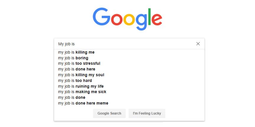 在Google输入“我的工作”,自动填充显示最高搜索量的词条有“我的工作很无聊”、“我的工作正在杀死我的灵魂”、“我的工作正在摧毁我的生活”……Psychology Today的一篇文章提到,超过一半的人上班期间没有完全投入工作,对他们来说,无聊甚至施加了和过量工作所带来的差不多大的压力。