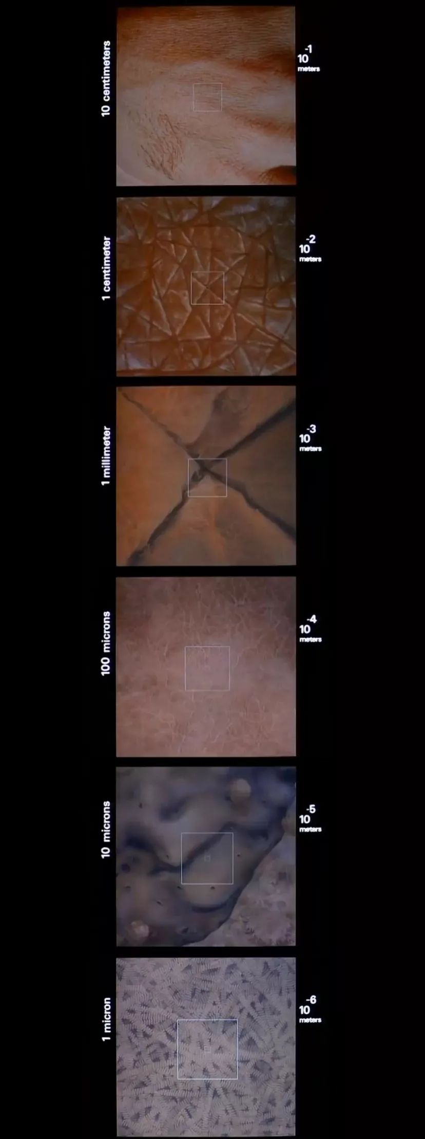 遥远的旅程结束,又回到熟睡的夫妻身边,镜头开始以负幂次方的距离推近:从皮肤表层结构到肌肉纤维,从蛋白质颗粒到DNA螺旋……