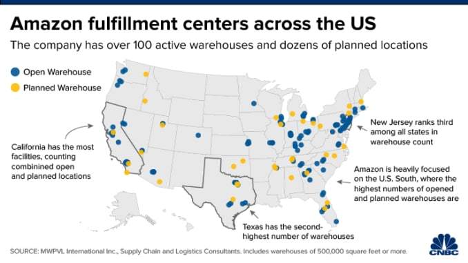 在西部的加州,亚马逊开设的订单交付中心是全国最多的,该公司计划在美国南部的许多地点开设中兴。