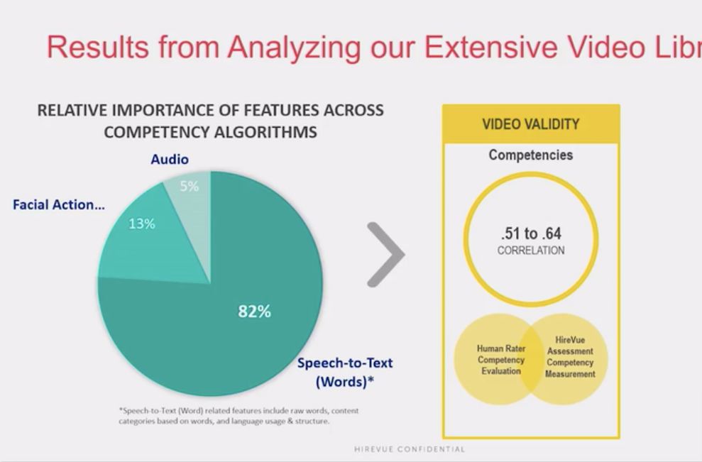 HireVue 负责人曾在公开场合分享,平台面试分析中各项因素所占的比重。