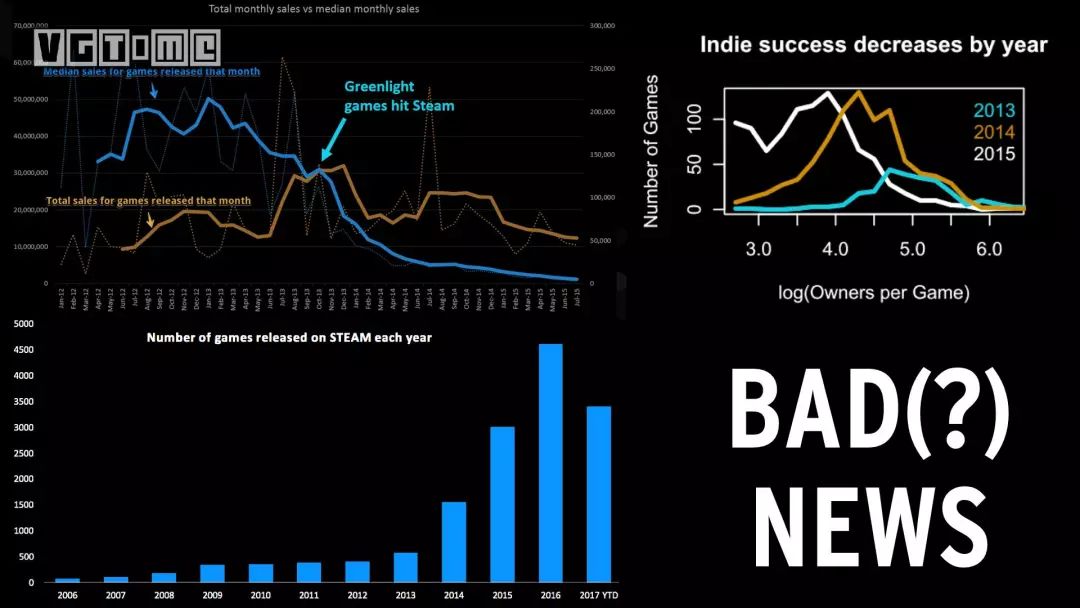 这些图表你可以理解为,Steam 上每年发行的游戏越来越多,销量和收入越来越低
