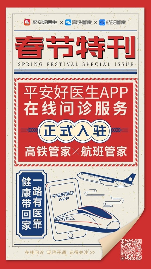 春运热潮已经开始,面对如此庞大的人员流动,加上运输工具空间相对狭小、空气流通差、人员密集、接触相对密切和频繁的特点,平安好医生宣布已联手航班管家&高铁管家提供在线问诊服务,打造“健康春运、平安春运”,将医疗服务与出行场景无缝连接,让在春运出行途中的用户便捷安心。