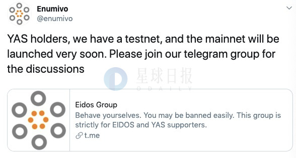 1月20日,ENU牛油果团队的新项目YAS官方推特显示,YAS主网已正式启动。根据电报群开发者公布的信息,支持主网的交易平台和钱包将优先交换,“因为它们为许多用户服务”,此外,大约3天之后团队将公布新的指令,将区块链升级到最新版本,届时将激活所有的功能。接下来一年,YAS团队将把重心转到EIDOS和YAS法典上。