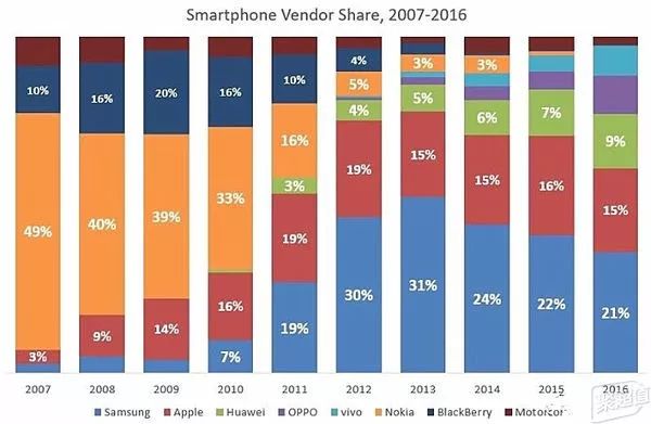 新玩家的上位也代表着老玩家的退场,12 年前称霸行业的公司现在还能坐在牌桌上的仅有三星一家,甚至连巅峰时代占据全球手机市场 40% 的诺基亚也已经不见了踪影。