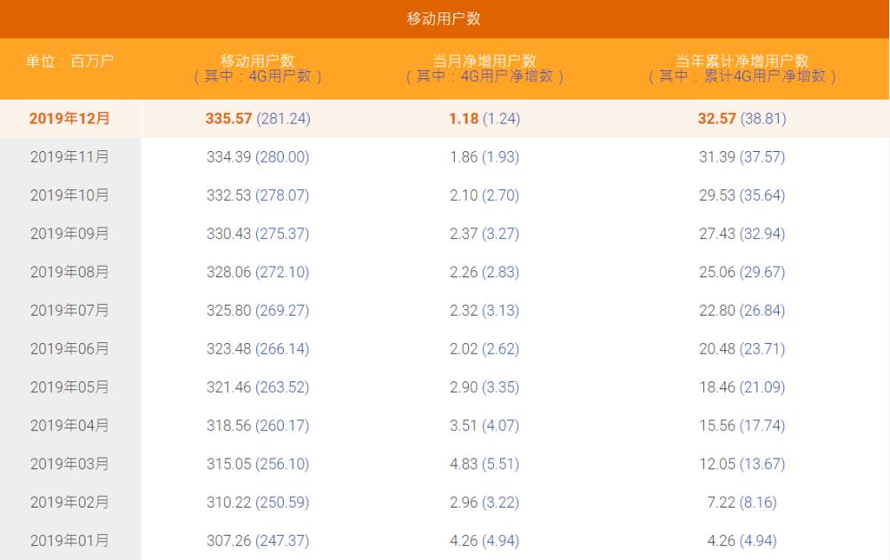 中国移动公布的2019年12月份运营数据。当月,中国移动的移动用户净增373.2万户,累计达到9.50277亿户。当月,中国移动4G用户净增498.5万户,累计达到7.58014亿户。有线宽带用户净减60.9万户,累计达到1.87041亿户。