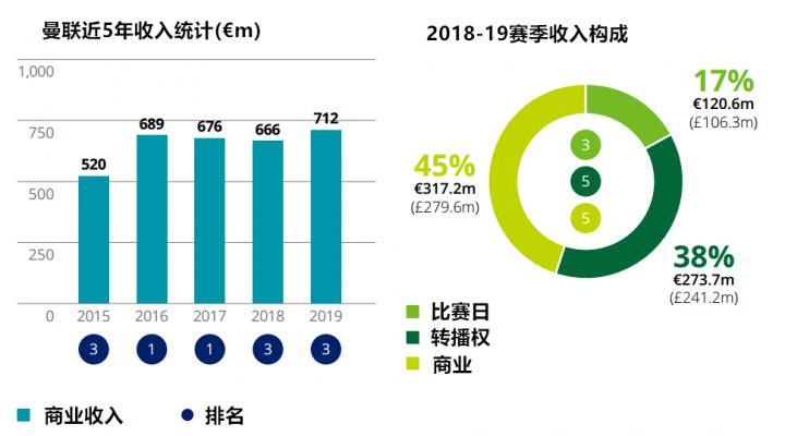 严格来说,曼联在连续三年收入下降(主要是因为英镑贬值)之后,2018-19赛季按照欧元折算的收入还出现了久违的上涨。但他们的比赛日和商业收入已经逐渐趋于稳定,这份上涨主要是因为他们打入欧冠八强拿到了不少的分成。