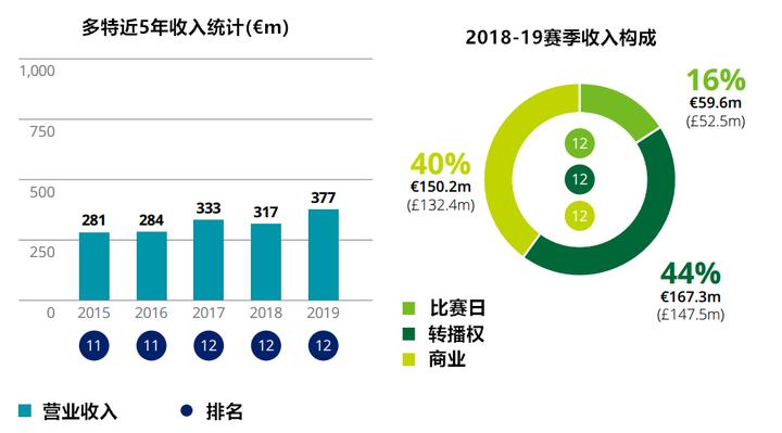 与身前的领先者拜仁一样,多特也处于一个非常稳定的经营周期。他们上赛季收入出现明显增长的动力来自转播权,一方面是打入欧冠十六强拿到了更多分成,另一方面是德甲总体转播权金额终于出现了久违的大幅增长,涨幅达到了12%。