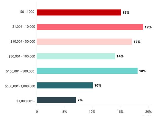 2. 最常见的网红预算是 1000-10000 美元/年,其次是 100000-500000 美元/年。