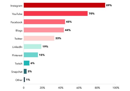 数据显示,2019 年 Instagram 吸引了更多的营销支出。69% 的营销人员在 Instagram 上花最多的钱进行影响力营销。这是 YouTube(11%)的 6 倍多,YouTube 是排名第二的热门平台。