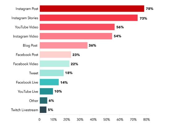 用户对故事的反应是积极的,因为他们认为这个即兴舞台,更真实,更容易了解。视频格式也很流行,YouTube 视频和 Instagram 视频在网红营销的有效格式列表中排名靠前。