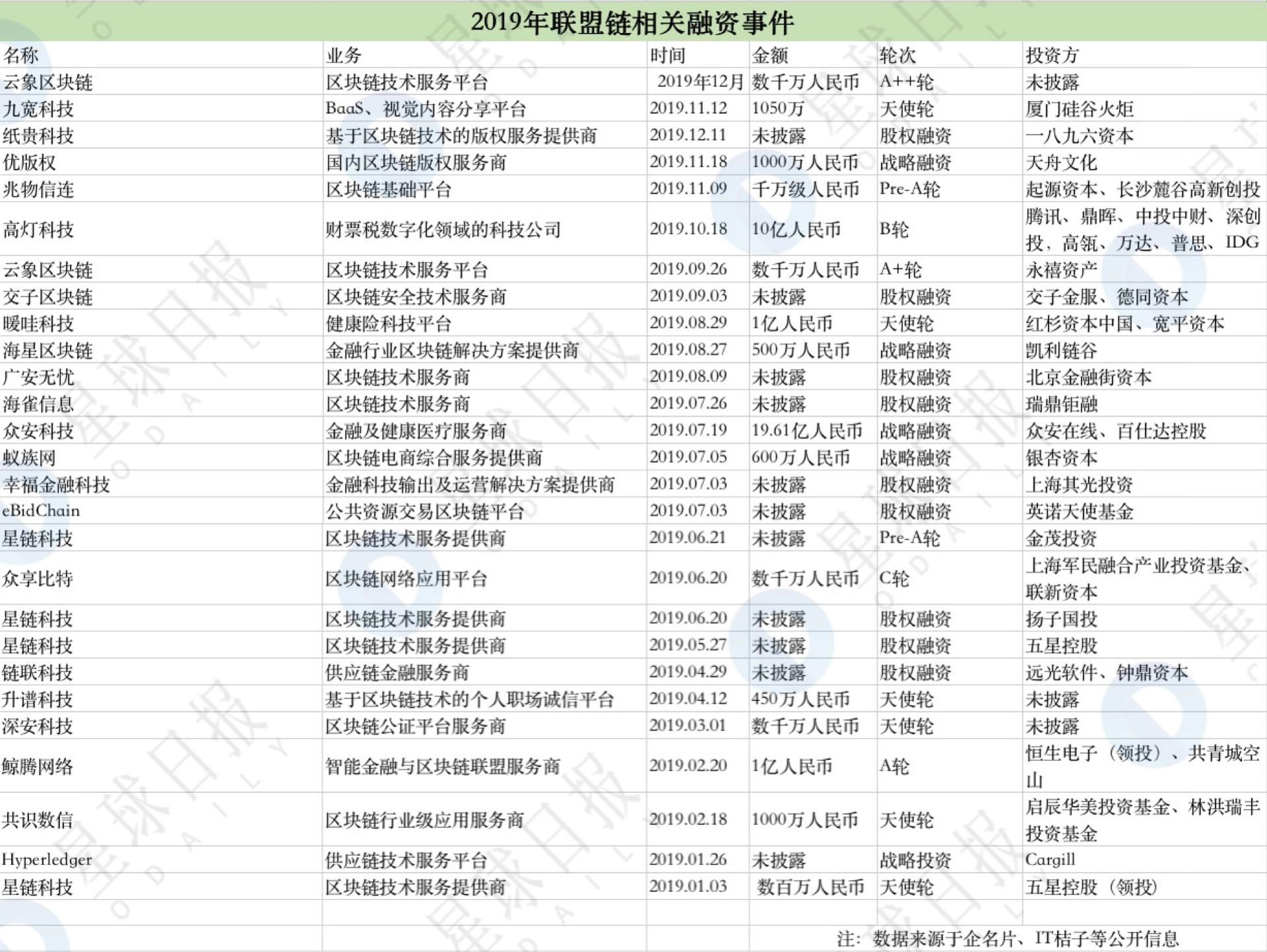 (Odaily星球日报根据企名片、IT桔子等平台数据统计的2019年联盟链相关的融资事件表。)