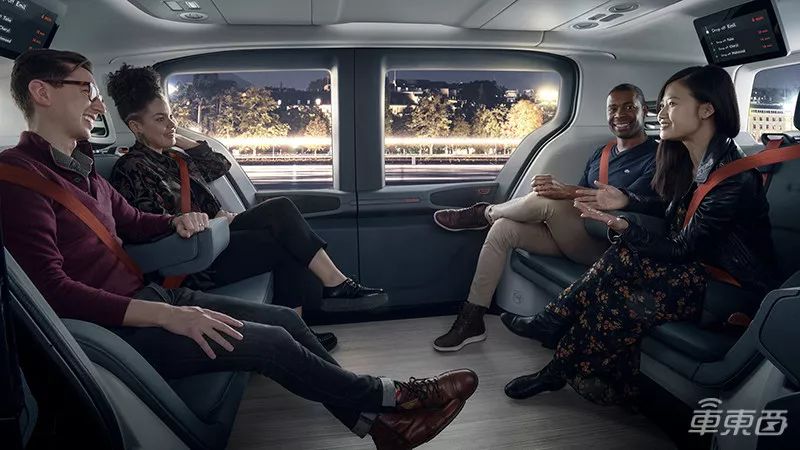 车内部有两个相对的长椅,两端都是屏幕,上到车上之后,可以看到里面没有方向盘、踏板、变速杆、座舱,这意味着车辆一旦发生意外,人类没有明显的方法可以控制这辆车。