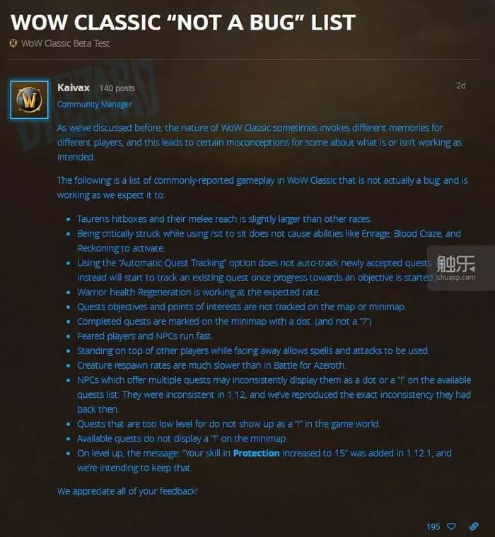 不堪其扰的暴雪发布了名为《〈魔兽世界〉怀旧服“不是Bug”列表》的公告,表示“这些功能完全如我们期望的那样运行着”。
